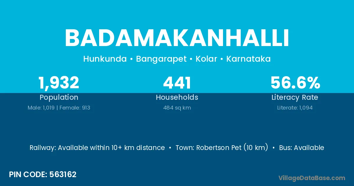Robertson Pet (10 km) is the nearest town to Badamakanhalli village for major economic activities and is located approximately 10 km away.