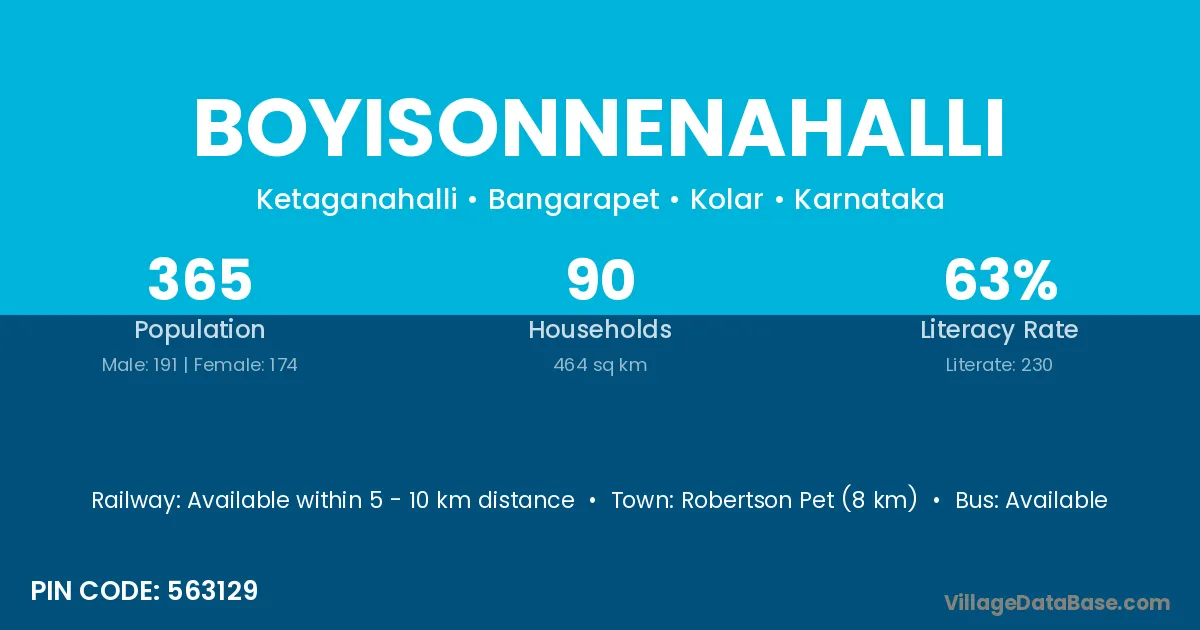 Robertson Pet (8 km) is the nearest town to Boyisonnenahalli village for major economic activities and is located approximately 8 km away.