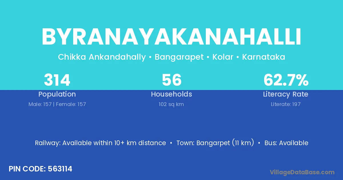 Bangarpet (11 km) is the nearest town to Byranayakanahalli village for major economic activities and is located approximately 11 km away.