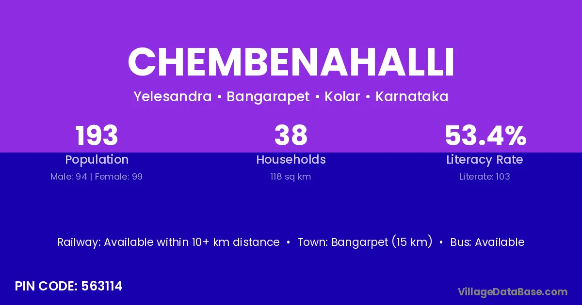 Bangarpet (15 km) is the nearest town to Chembenahalli village for major economic activities and is located approximately 15 km away.