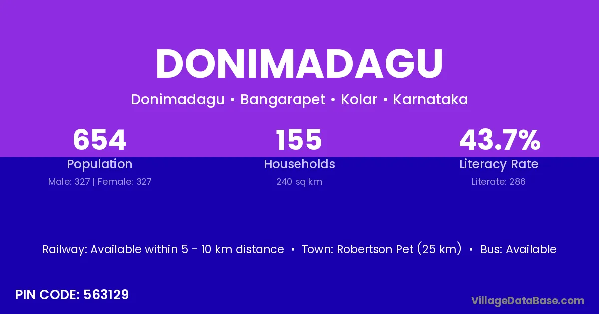 Robertson Pet (25 km) is the nearest town to Donimadagu village for major economic activities and is located approximately 25 km away.