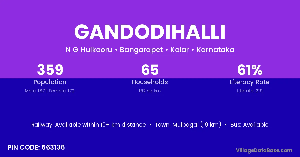 Mulbagal (19 km) is the nearest town to Gandodihalli village for major economic activities and is located approximately 19 km away.