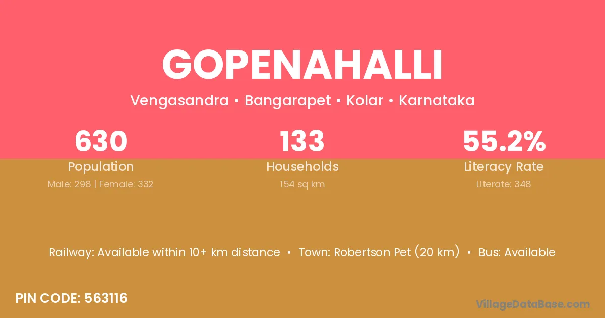 Robertson Pet (20 km) is the nearest town to Gopenahalli village for major economic activities and is located approximately 20 km away.