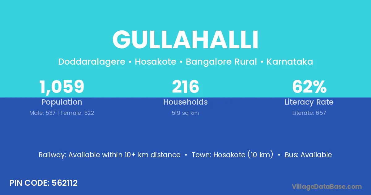 Bangarpet (18 km) is the nearest town to Gullahalli village for major economic activities and is located approximately 18 km away.