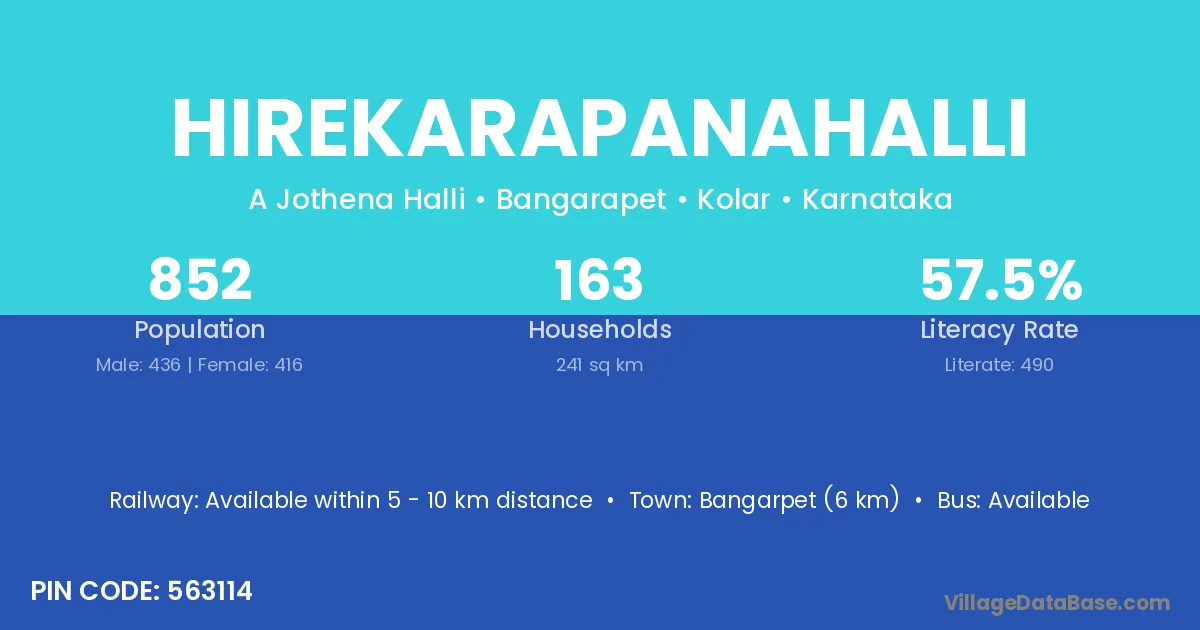Bangarpet (6 km) is the nearest town to Hirekarapanahalli village for major economic activities and is located approximately 6 km away.