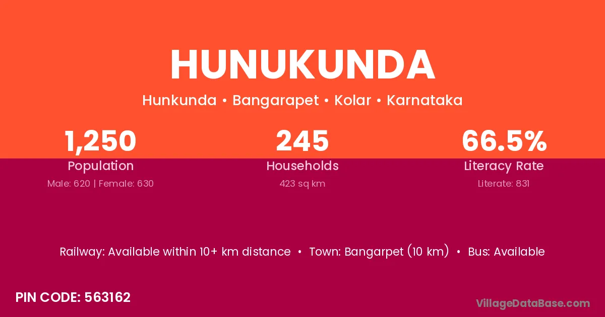 Bangarpet (10 km) is the nearest town to Hunukunda village for major economic activities and is located approximately 10 km away.