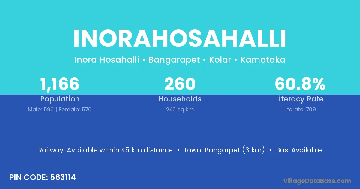 Bangarpet (3 km) is the nearest town to Inorahosahalli village for major economic activities and is located approximately 3 km away.