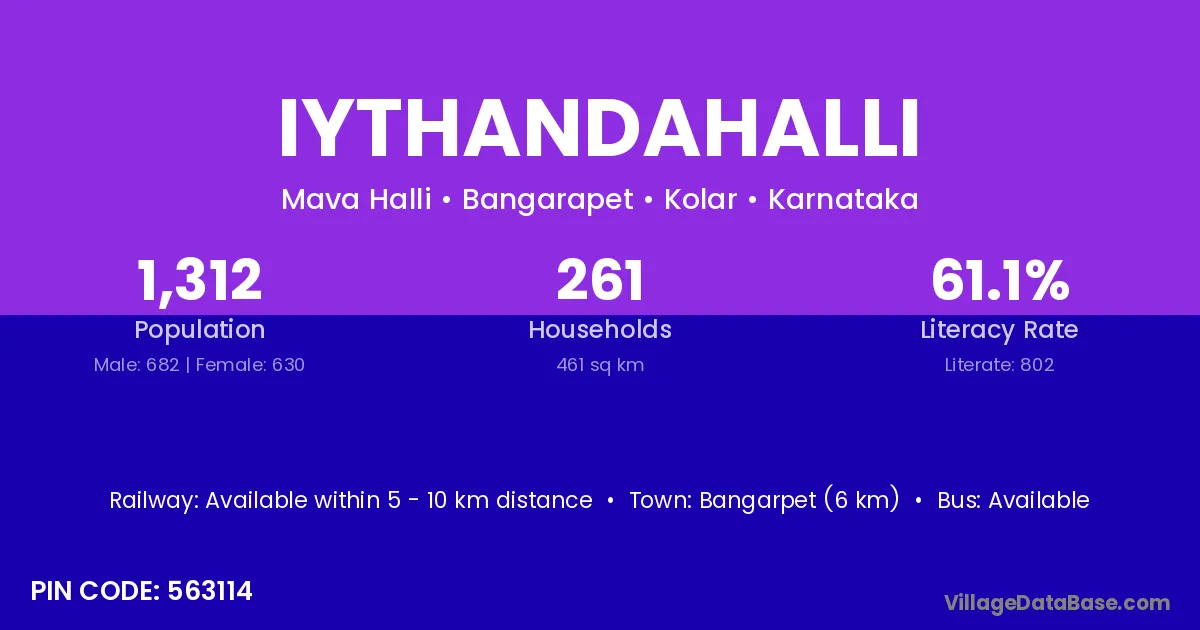 Bangarpet (6 km) is the nearest town to Iythandahalli village for major economic activities and is located approximately 6 km away.