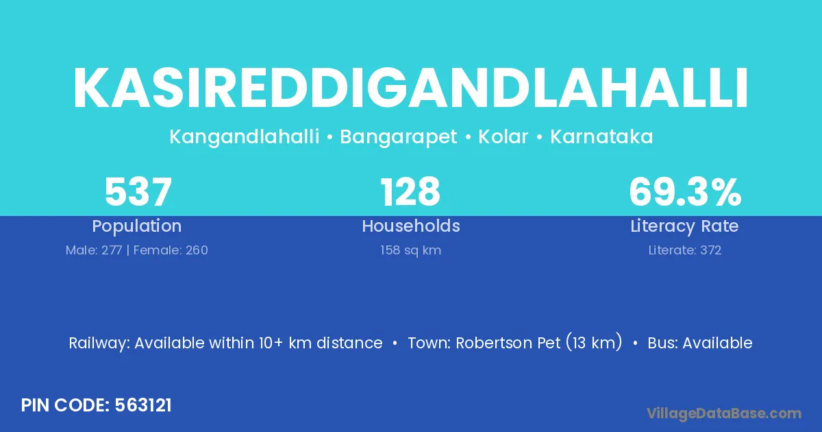 Robertson Pet (13 km) is the nearest town to Kasireddigandlahalli village for major economic activities and is located approximately 13 km away.