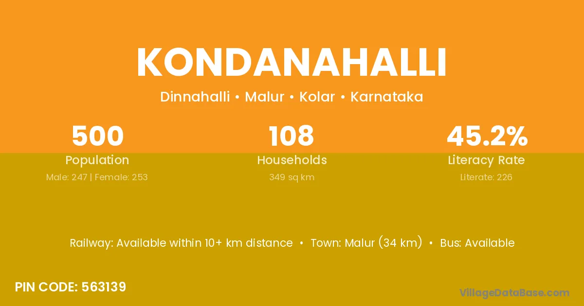 Bangarpet (15 km) is the nearest town to Kondanahalli village for major economic activities and is located approximately 15 km away.
