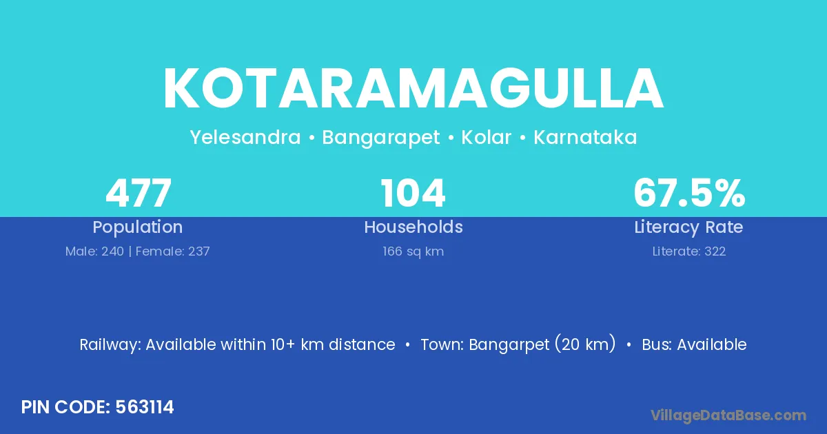Bangarpet (20 km) is the nearest town to Kotaramagulla village for major economic activities and is located approximately 20 km away.