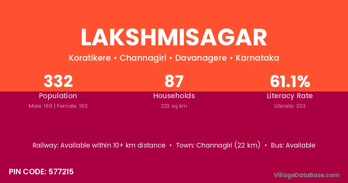 Lakshmisagar village has a total population of 229 people, of which 116 are males and 113 are females.