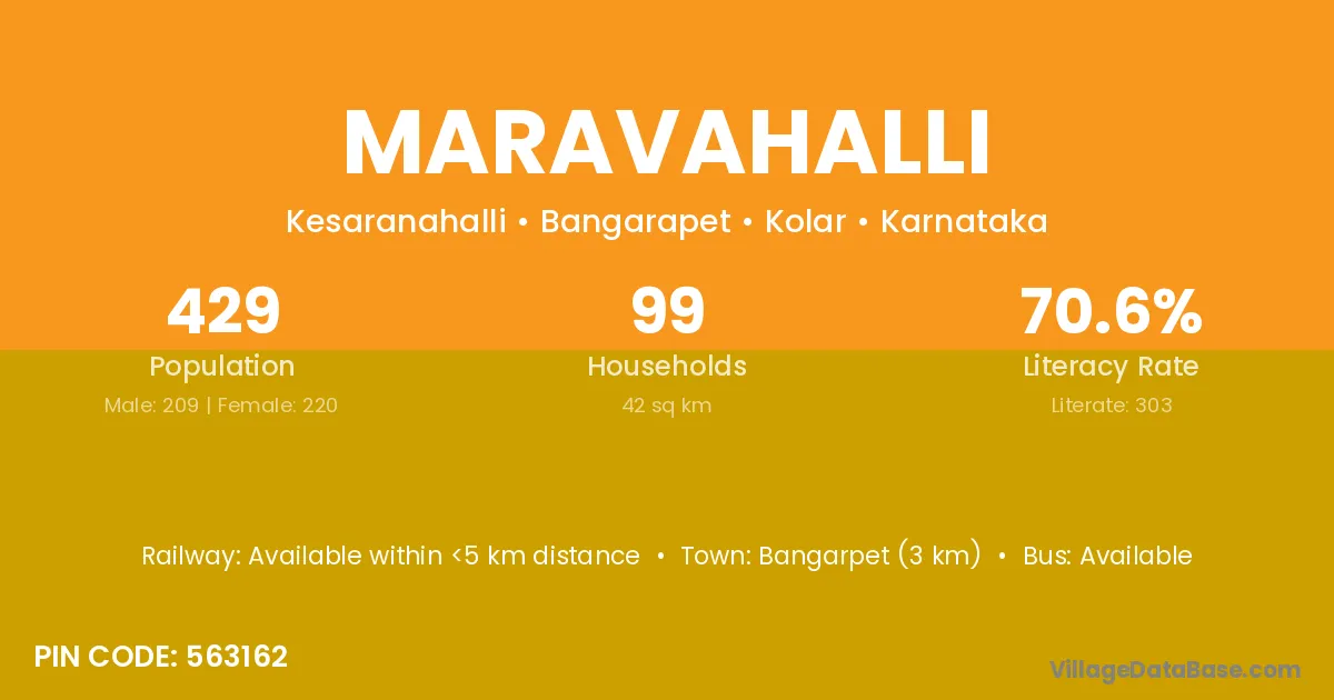 Bangarpet (3 km) is the nearest town to Maravahalli village for major economic activities and is located approximately 3 km away.