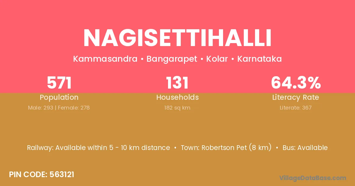 Robertson Pet (8 km) is the nearest town to Nagisettihalli village for major economic activities and is located approximately 8 km away.