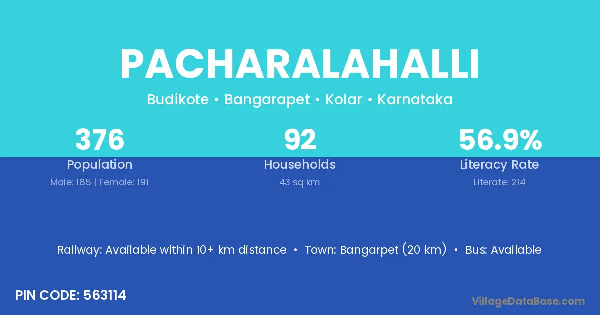 Bangarpet (20 km) is the nearest town to Pacharalahalli village for major economic activities and is located approximately 20 km away.
