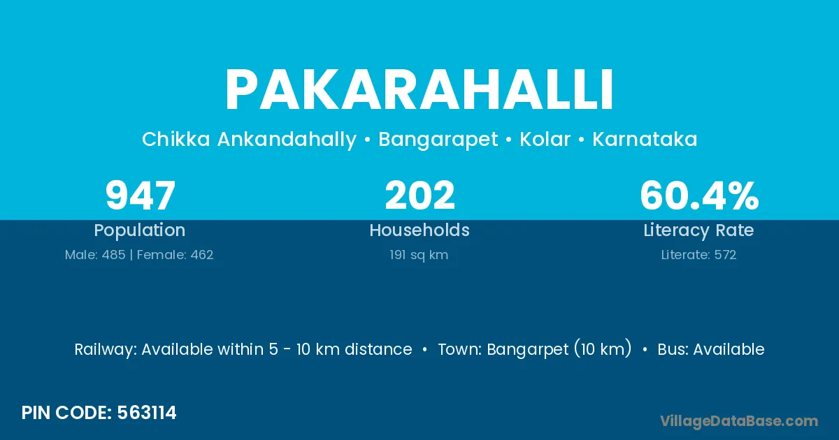 Bangarpet (10 km) is the nearest town to Pakarahalli village for major economic activities and is located approximately 10 km away.