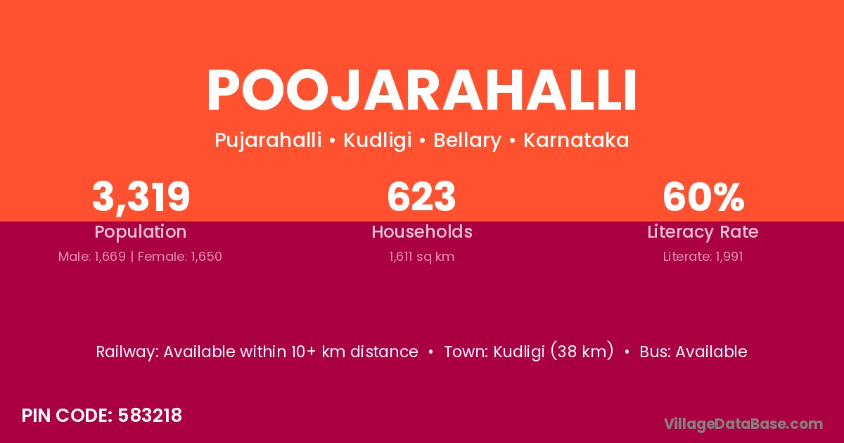 The literacy rate of Poojarahalli village is 52.25%. Male literacy stands at 52.83% and female literacy at 51.72%.