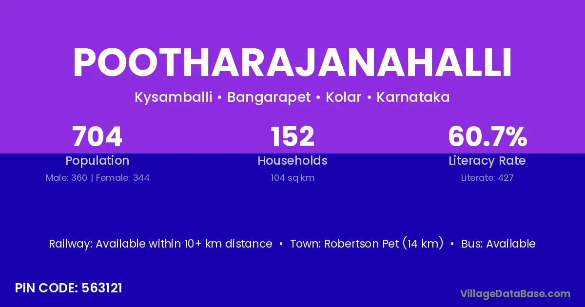 Robertson Pet (14 km) is the nearest town to Pootharajanahalli village for major economic activities and is located approximately 14 km away.