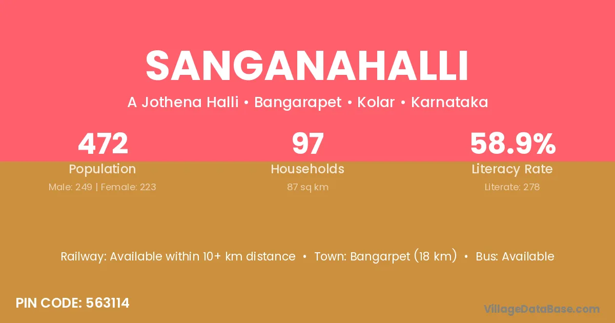 Bangarpet (18 km) is the nearest town to Sanganahalli village for major economic activities and is located approximately 18 km away.