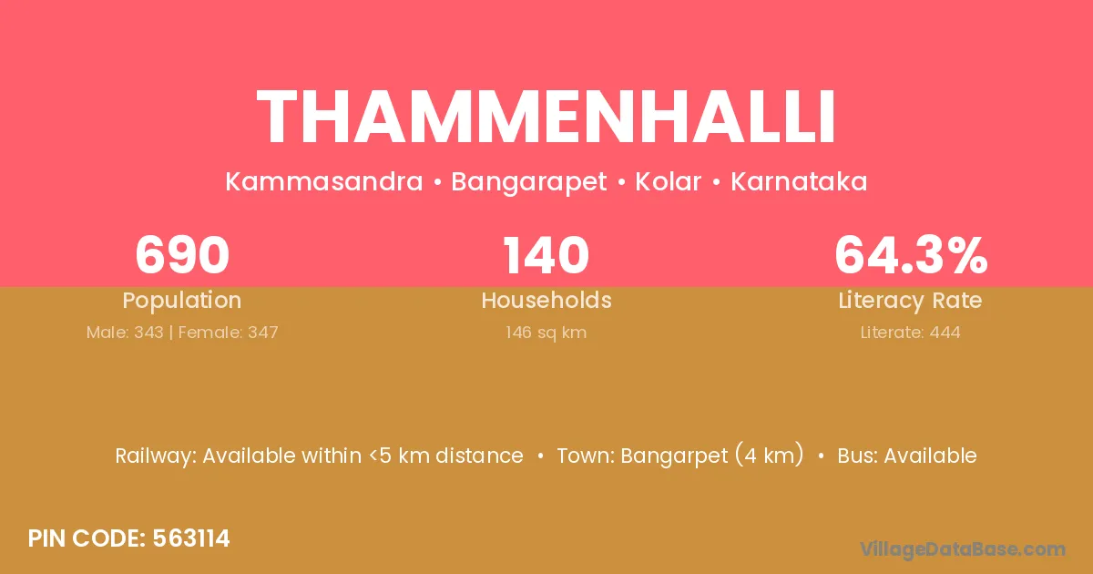 Bangarpet (4 km) is the nearest town to Thammenhalli village for major economic activities and is located approximately 4 km away.