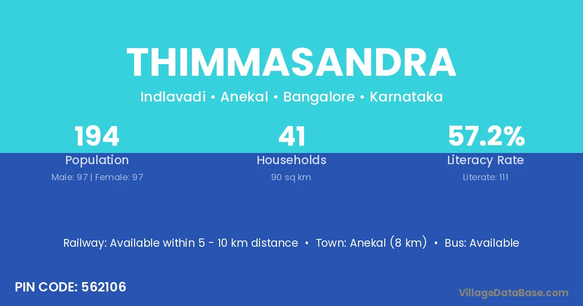 Robertson Pet (15 km) is the nearest town to Thimmasandra village for major economic activities and is located approximately 15 km away.