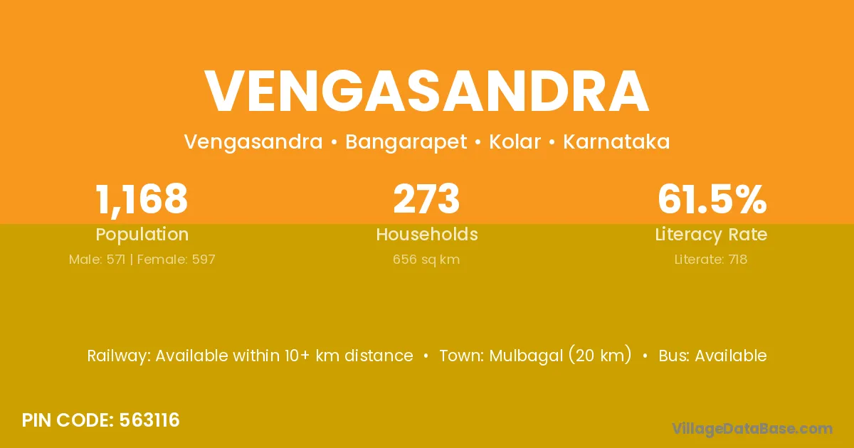 Mulbagal (20 km) is the nearest town to Vengasandra village for major economic activities and is located approximately 20 km away.