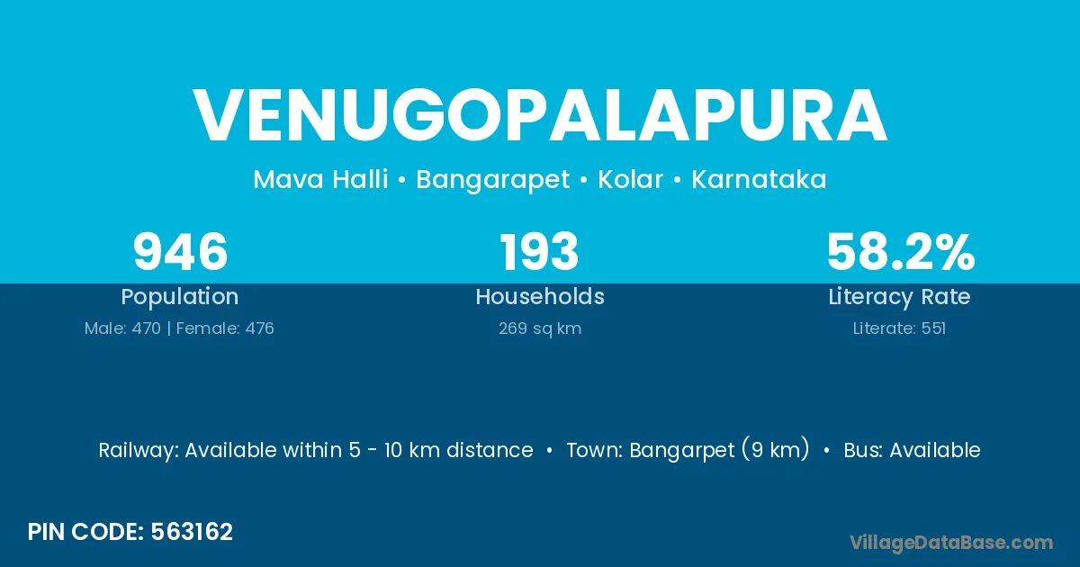 Bangarpet (9 km) is the nearest town to Venugopalapura village for major economic activities and is located approximately 9 km away.