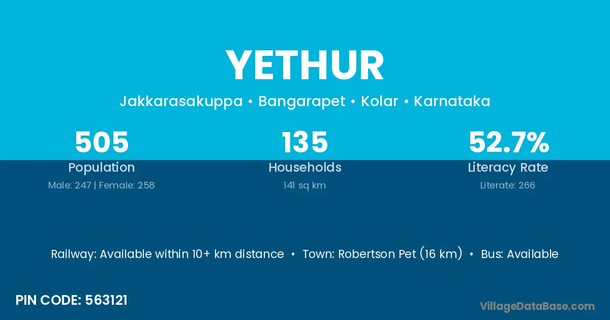 Robertson Pet (16 km) is the nearest town to Yethur village for major economic activities and is located approximately 16 km away.