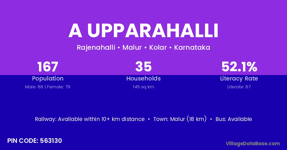 Malur (18 km) is the nearest town to A Upparahalli village for major economic activities and is located approximately 18 km away.