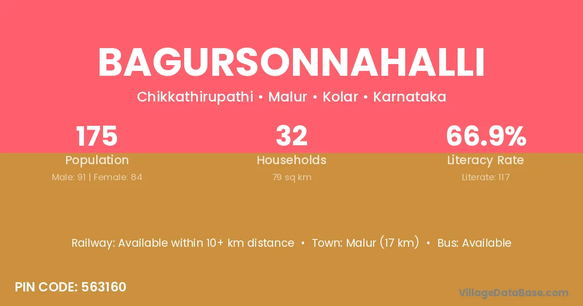 Malur (17 km) is the nearest town to Bagursonnahalli village for major economic activities and is located approximately 17 km away.