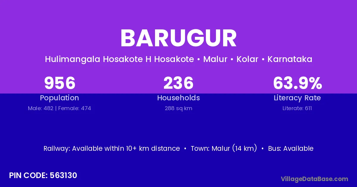Malur (14 km) is the nearest town to Barugur village for major economic activities and is located approximately 14 km away.