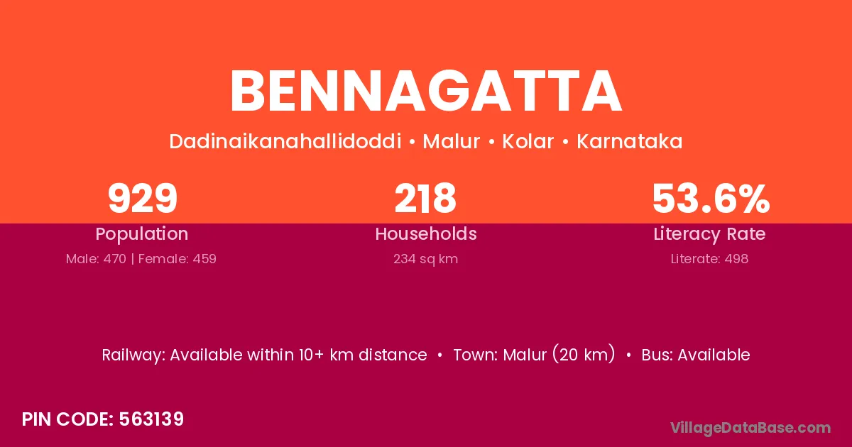 Malur (20 km) is the nearest town to Bennagatta village for major economic activities and is located approximately 20 km away.