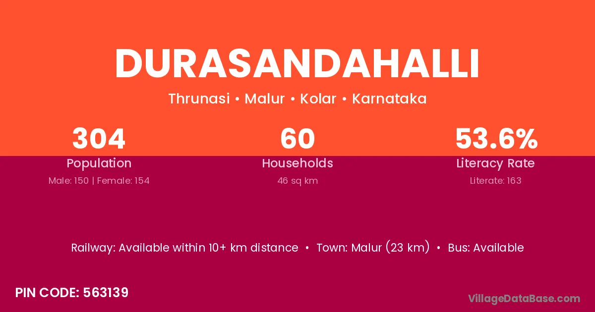 Malur (23 km) is the nearest town to Durasandahalli village for major economic activities and is located approximately 23 km away.