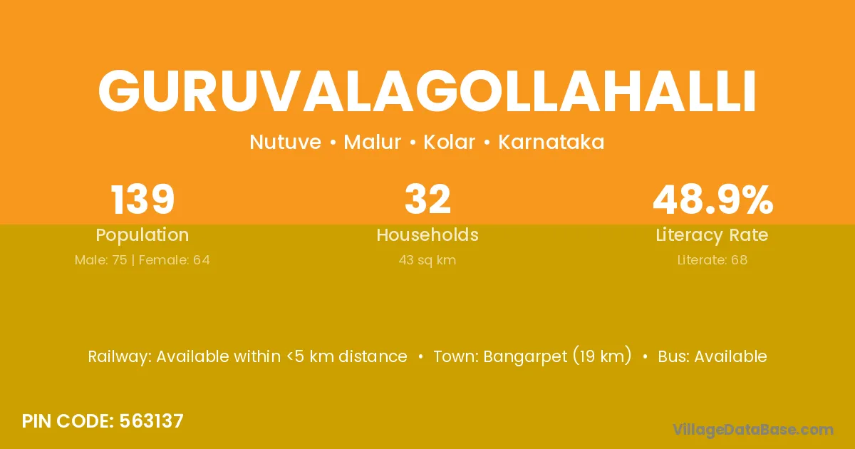 Guruvalagollahalli village has a total population of 139 people, of which 75 are males and 64 are females.