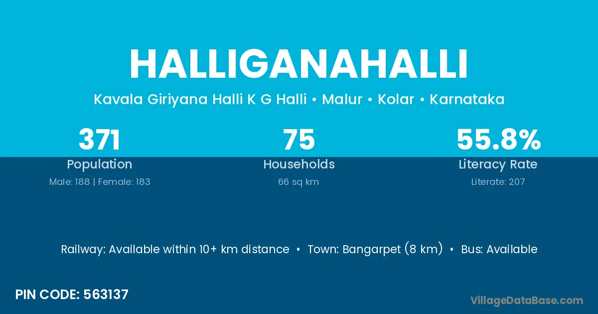 Bangarpet (8 km) is the nearest town to Halliganahalli village for major economic activities and is located approximately 8 km away.