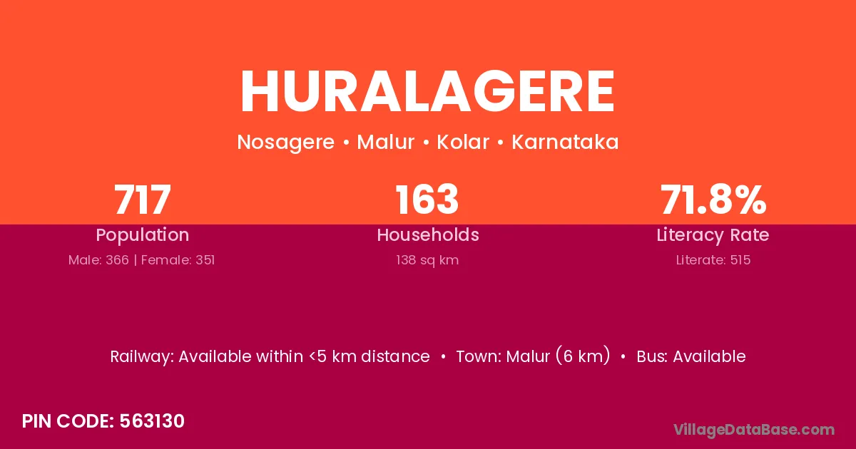Malur (6 km) is the nearest town to Huralagere village for major economic activities and is located approximately 6 km away.