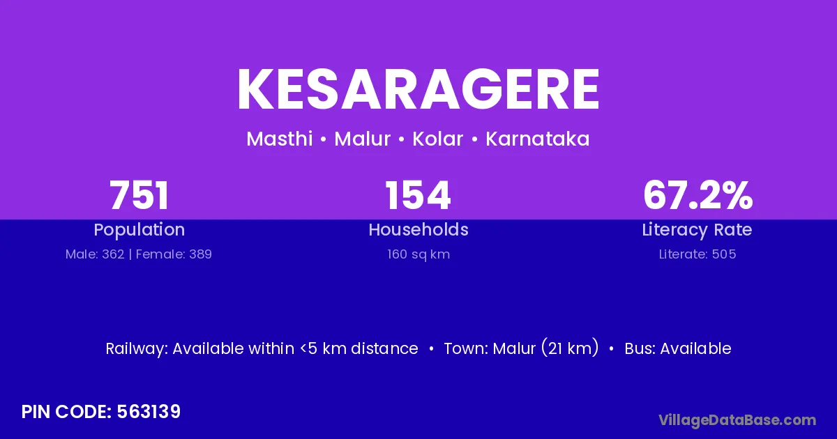 Malur (21 km) is the nearest town to Kesaragere village for major economic activities and is located approximately 21 km away.