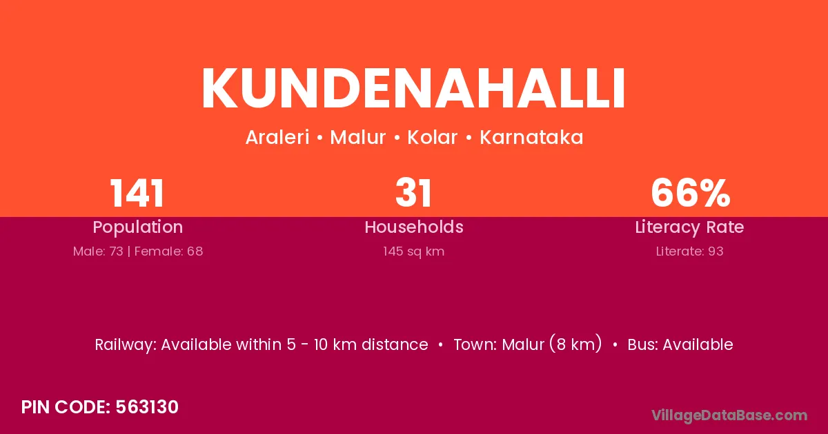 Kundenahalli village has a total population of 141 people, of which 73 are males and 68 are females.