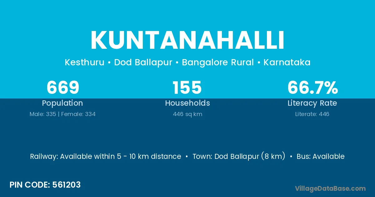 Malur (15 km) is the nearest town to Kuntanahalli village for major economic activities and is located approximately 15 km away.