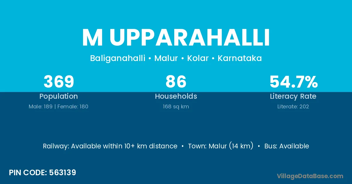 Malur (14 km) is the nearest town to M Upparahalli village for major economic activities and is located approximately 14 km away.
