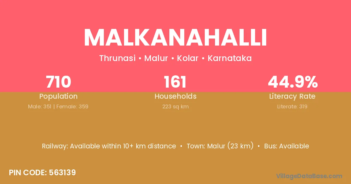 Malur (23 km) is the nearest town to Malkanahalli village for major economic activities and is located approximately 23 km away.