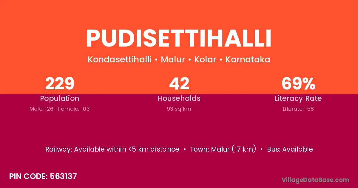 Malur (17 km) is the nearest town to Pudisettihalli village for major economic activities and is located approximately 17 km away.