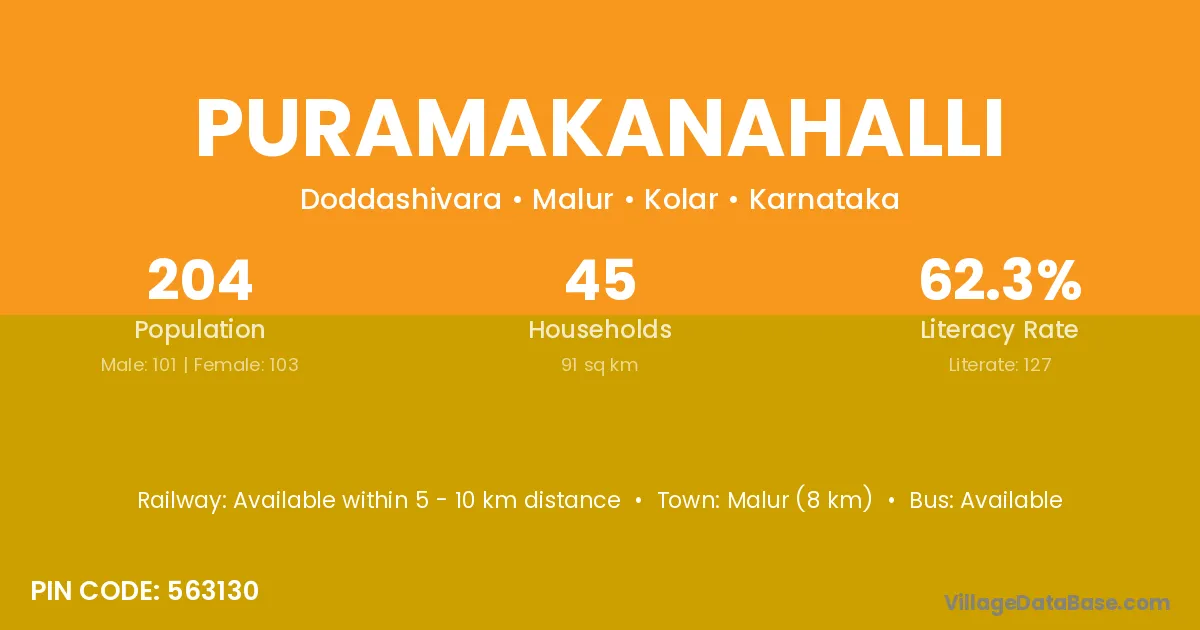 Puramakanahalli village has a total population of 204 people, of which 101 are males and 103 are females.