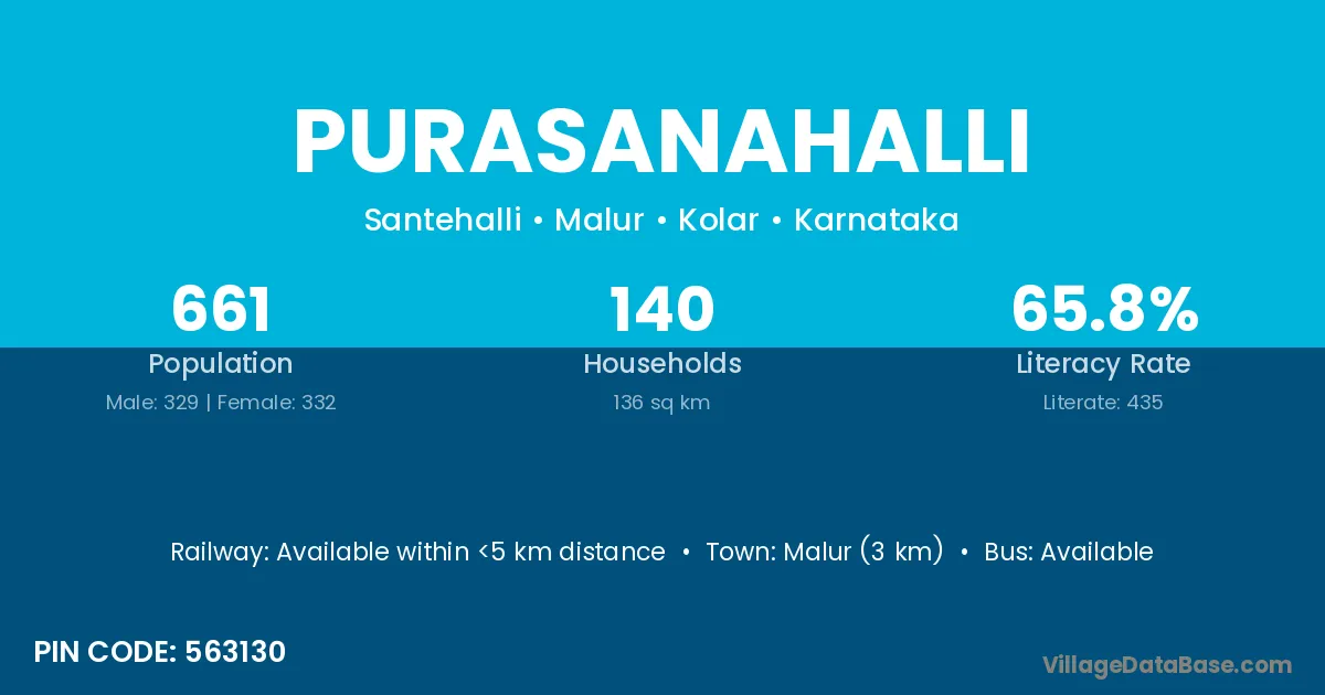 Malur (3 km) is the nearest town to Purasanahalli village for major economic activities and is located approximately 3 km away.