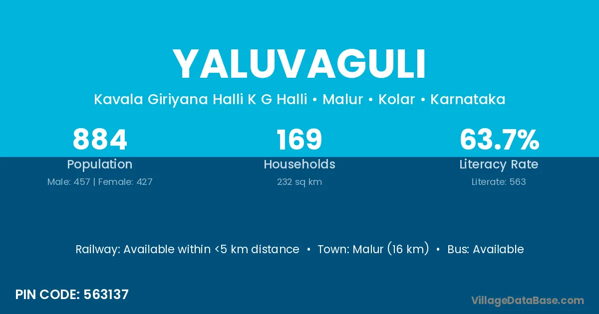 Malur (16 km) is the nearest town to Yaluvaguli village for major economic activities and is located approximately 16 km away.