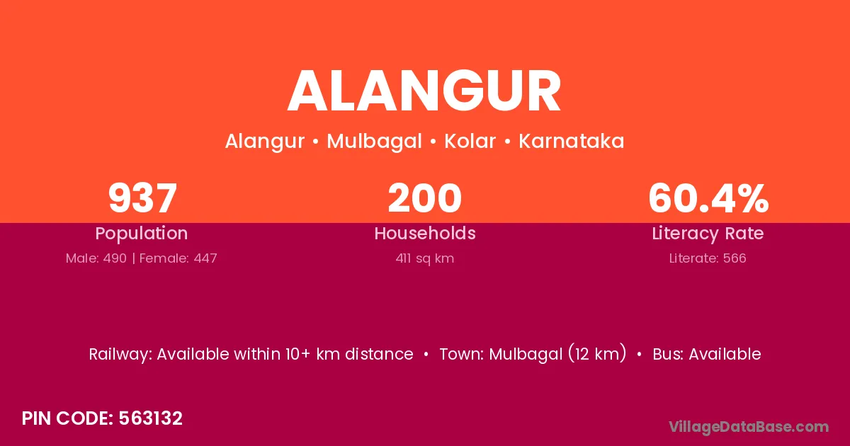 Mulbagal (12 km) is the nearest town to Alangur village for major economic activities and is located approximately 12 km away.