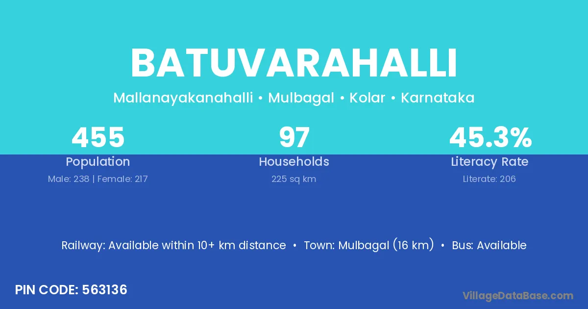 Batuvarahalli village has a total population of 455 people, of which 238 are males and 217 are females.