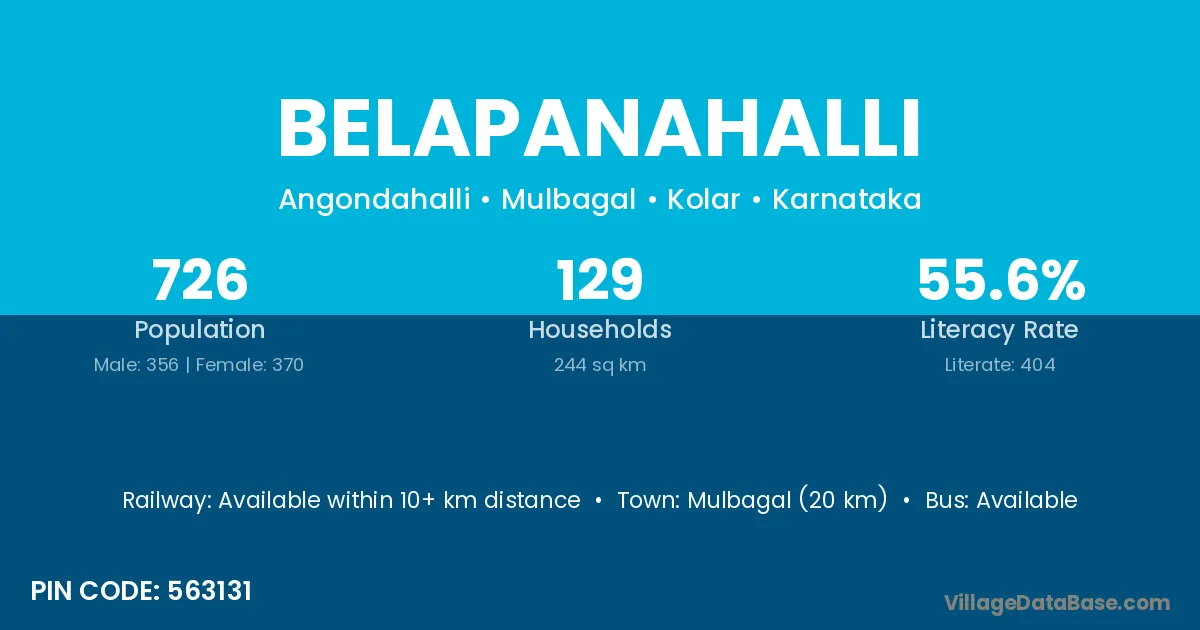 Mulbagal (20 km) is the nearest town to Belapanahalli village for major economic activities and is located approximately 20 km away.