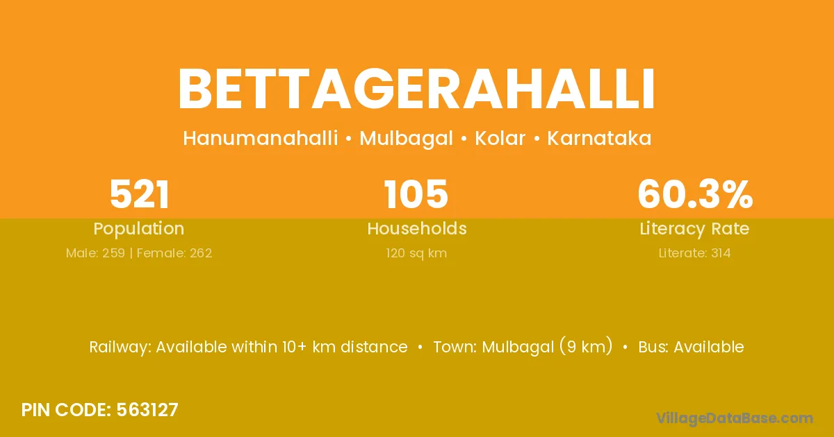 Mulbagal (9 km) is the nearest town to Bettagerahalli village for major economic activities and is located approximately 9 km away.