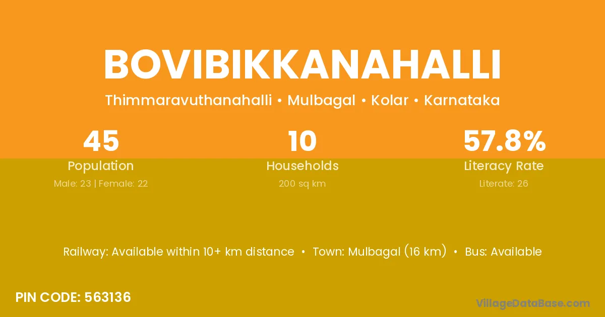 Mulbagal (16 km) is the nearest town to Bovibikkanahalli village for major economic activities and is located approximately 16 km away.